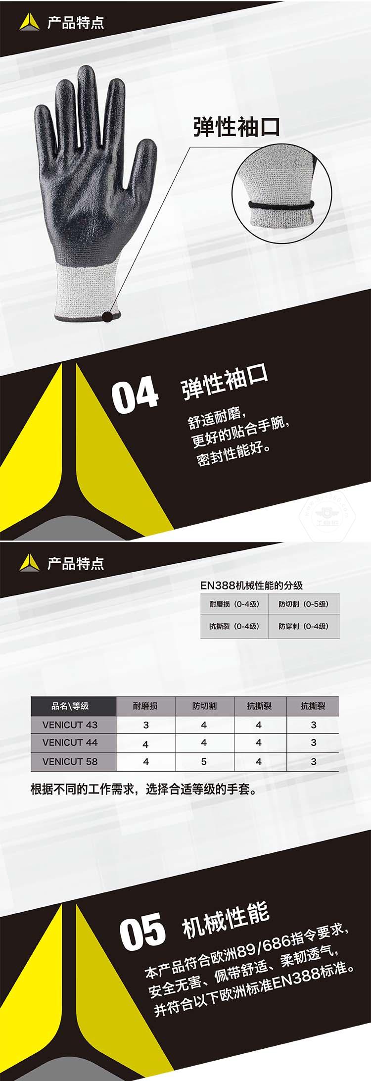 商品名稱(chēng):代爾塔 3副裝防割勞保工作手套 VENICUT43(3級耐磨4級防割)