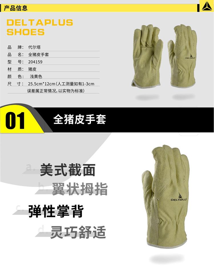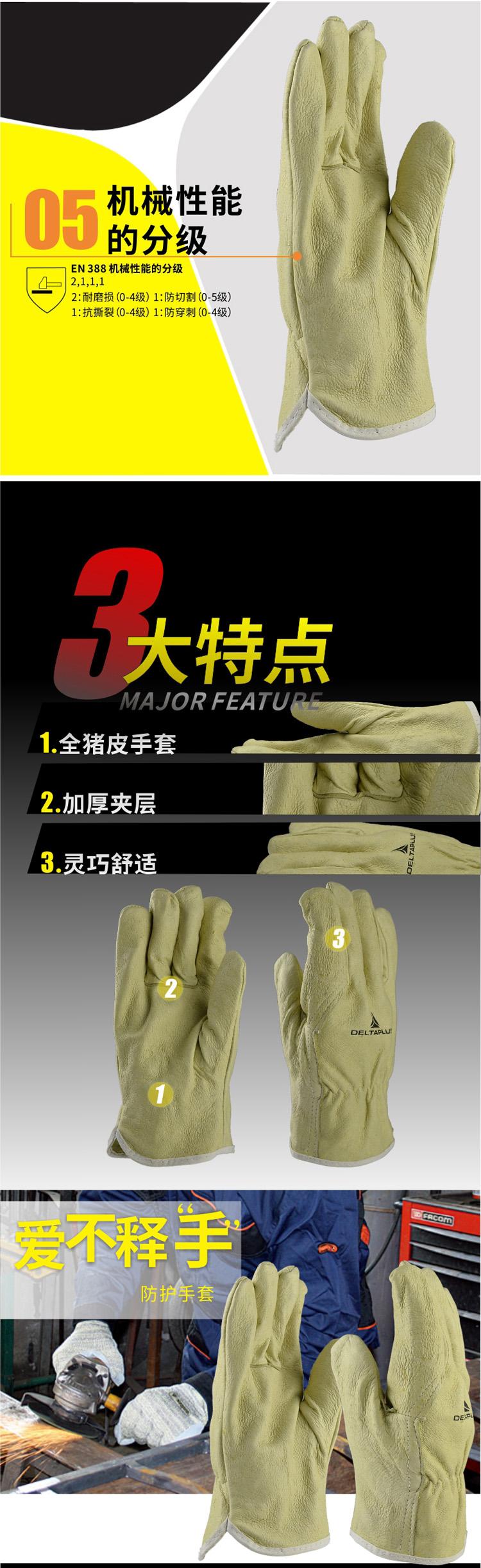 商品名稱(chēng):代爾塔 全豬皮搬運勞保手套 耐磨透氣靈巧安.全手套 機械加工修理造船204159 淺黃色9#