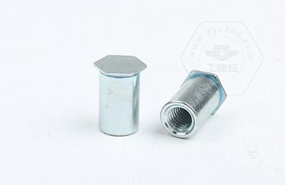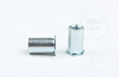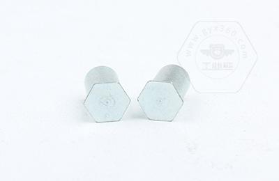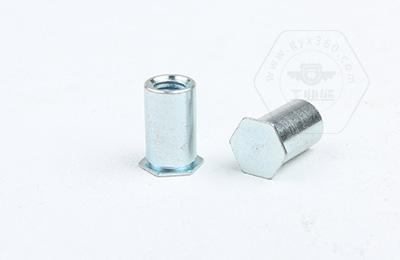 通過(guò)壓力機將六角頭壓入薄板的預置孔內(預置孔的孔徑一般略大于壓鉚螺柱的圓柱外徑)使孔的周邊產(chǎn)生塑性變形,變形部分被擠入壓鉚螺母柱的退刀槽內,使壓鉚螺母柱鉚緊于薄板上,從而在薄板上形成一下有效固定的內螺紋。